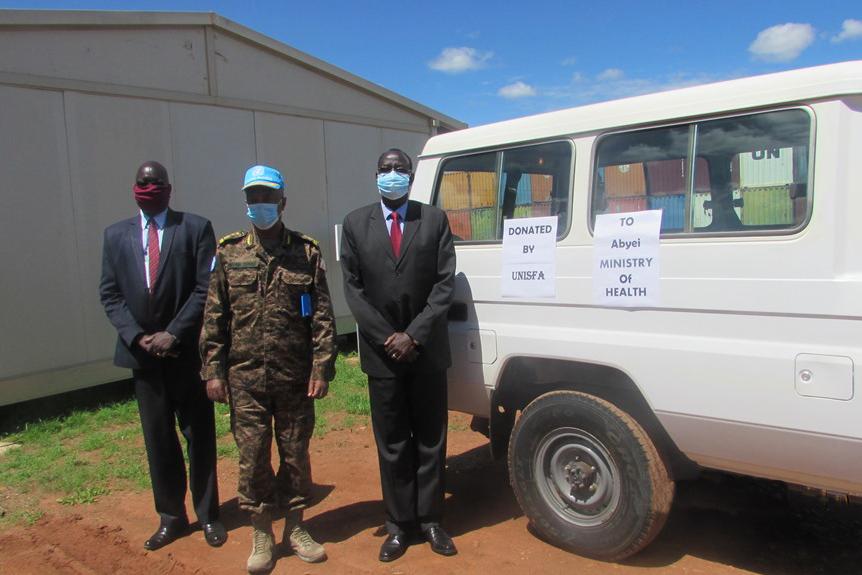 UNISFA’s Acting Head of Mission and Force Commander, Major General Mehari Gebremariam, presents the key of a Toyota Landcruiser to the new Juba Appointed Chief Administrator. The gift of the vehicle is part of the Mission’s…